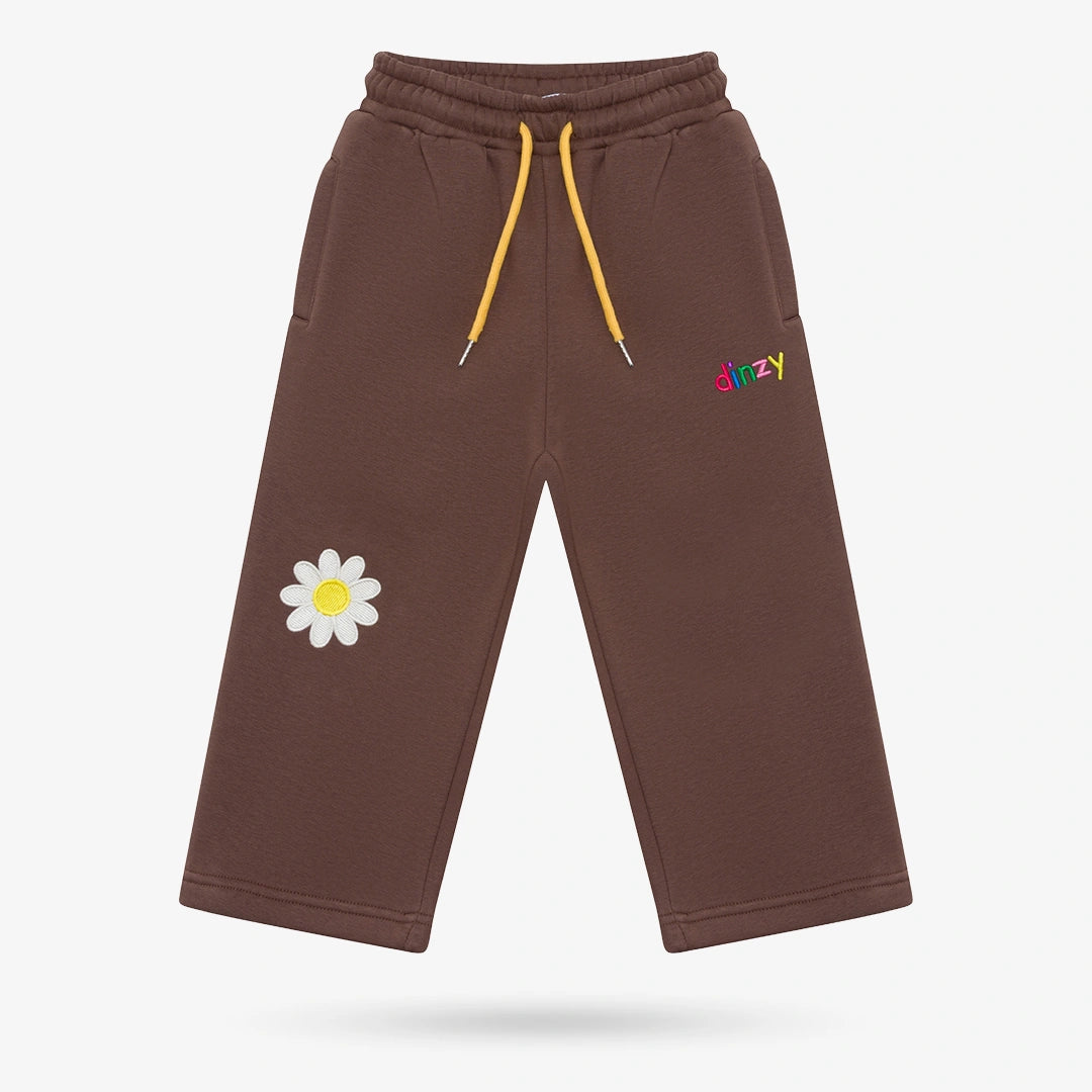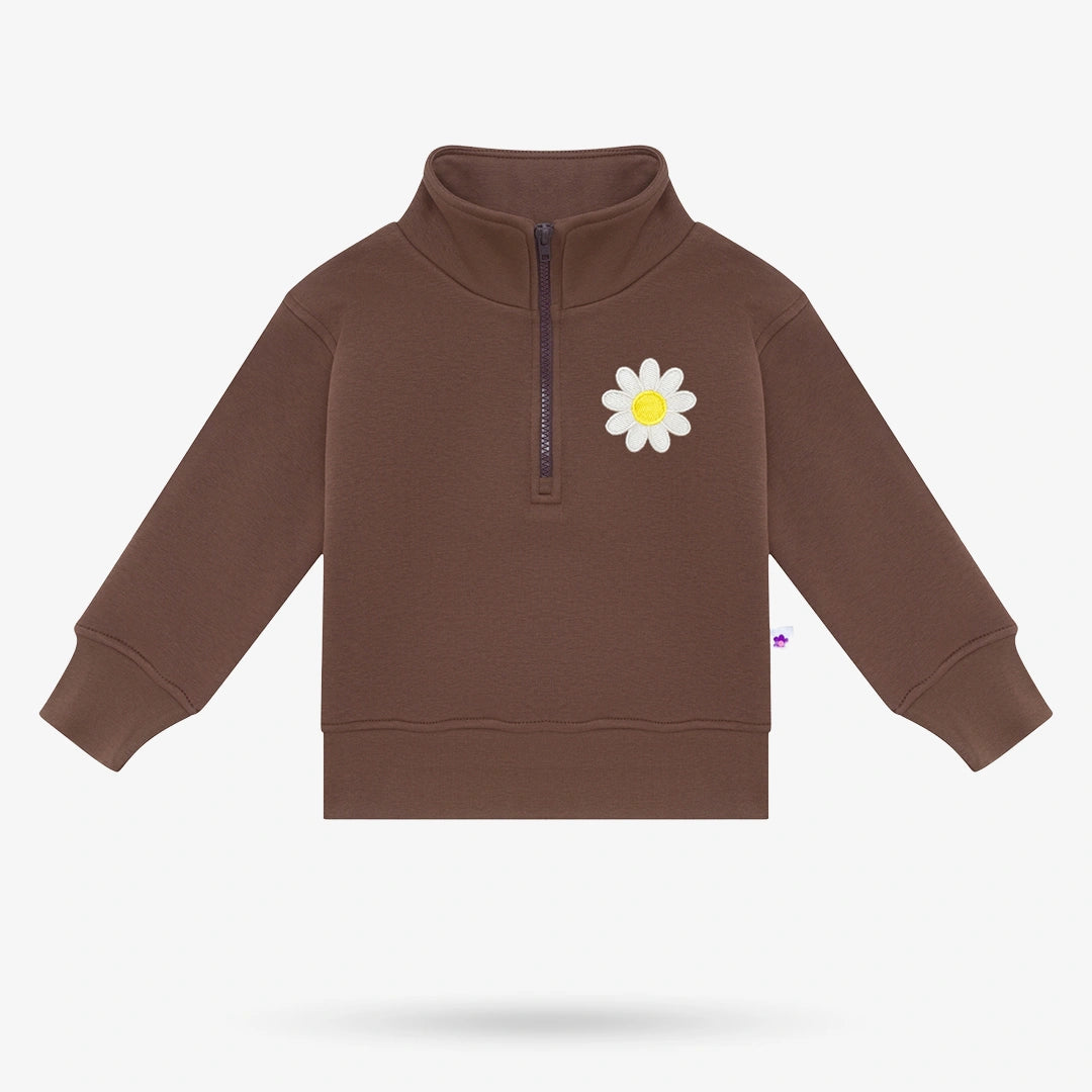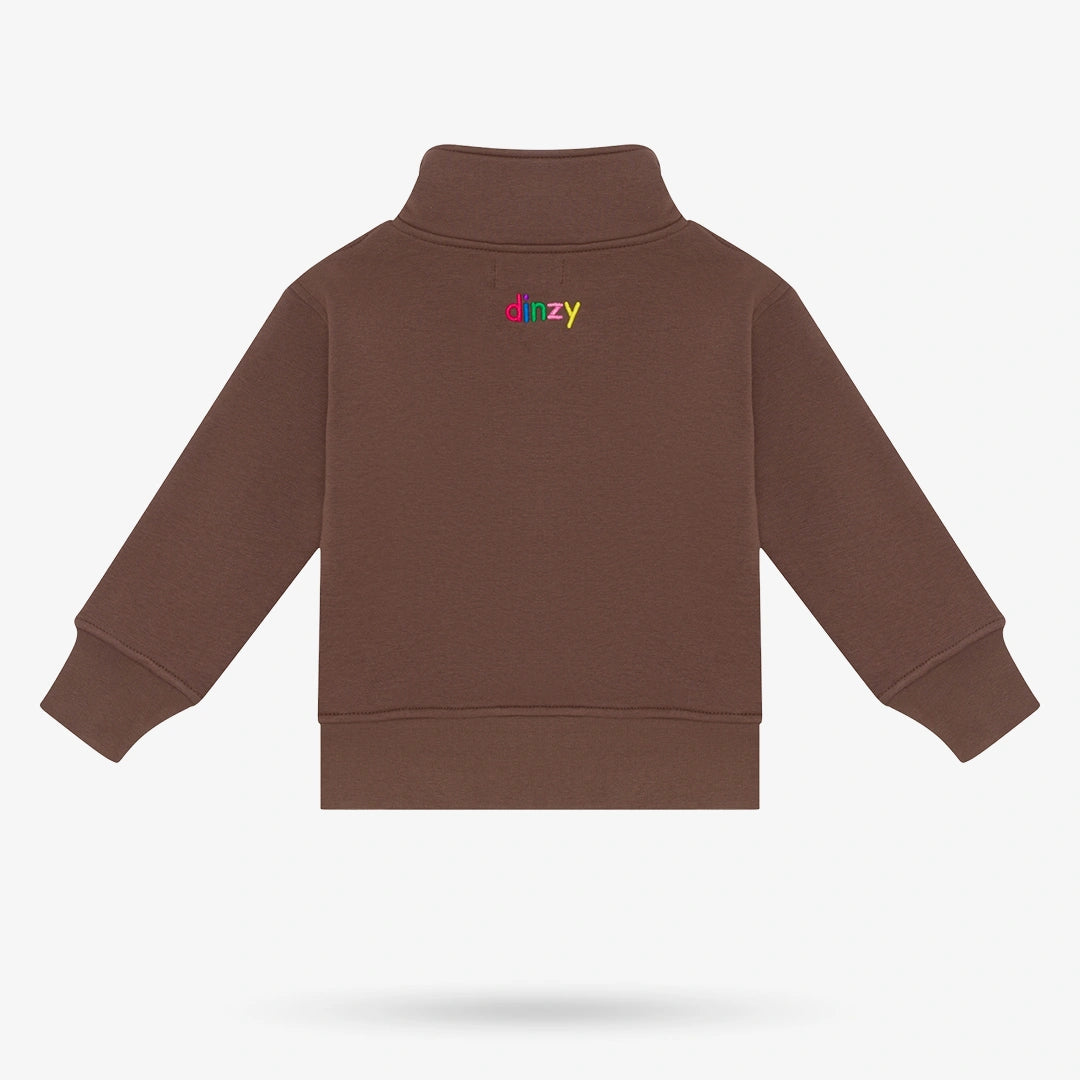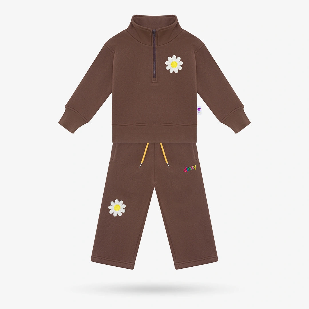 • 2-Piece Set: Sweater & Pants• Color: Chocolate Brown• 300 GSM mid-weight cotton fleece• High neck with half-zip• Long sleeves• Pants have elastic waistband and Yellow drawstring• Multi-colored embroidery