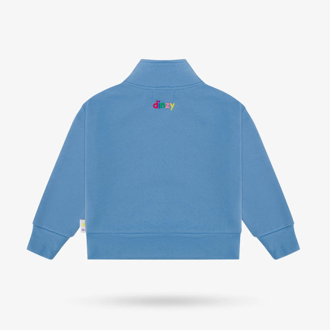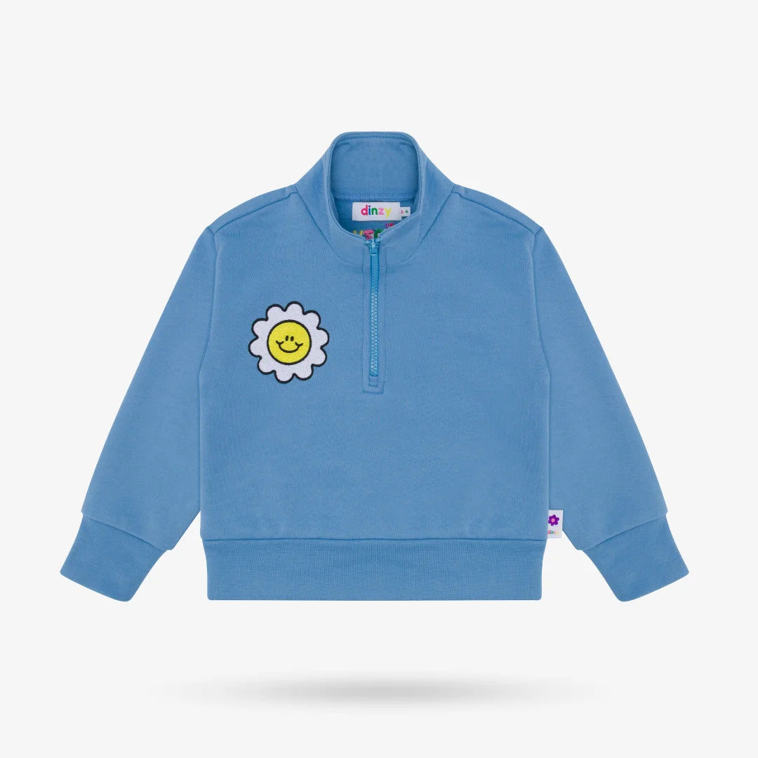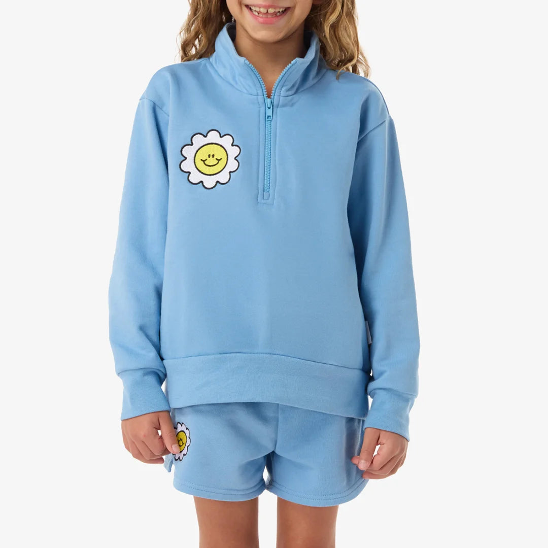 • 2-Piece Set: Sweater & Shorts• Color: Blue• 270 GSM mid-weight cotton fleece• High neck with half-zip• Long sleeves• Pants have elastic waistband and Yellow drawstring• Multi-colored embroidery