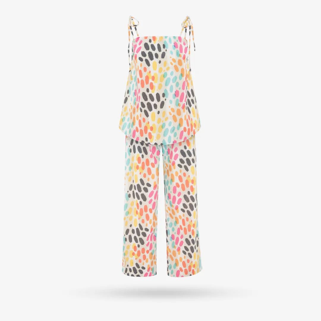 Premium quality 2 piece set with pants and tie-up sleeveless top with colorful patterns.