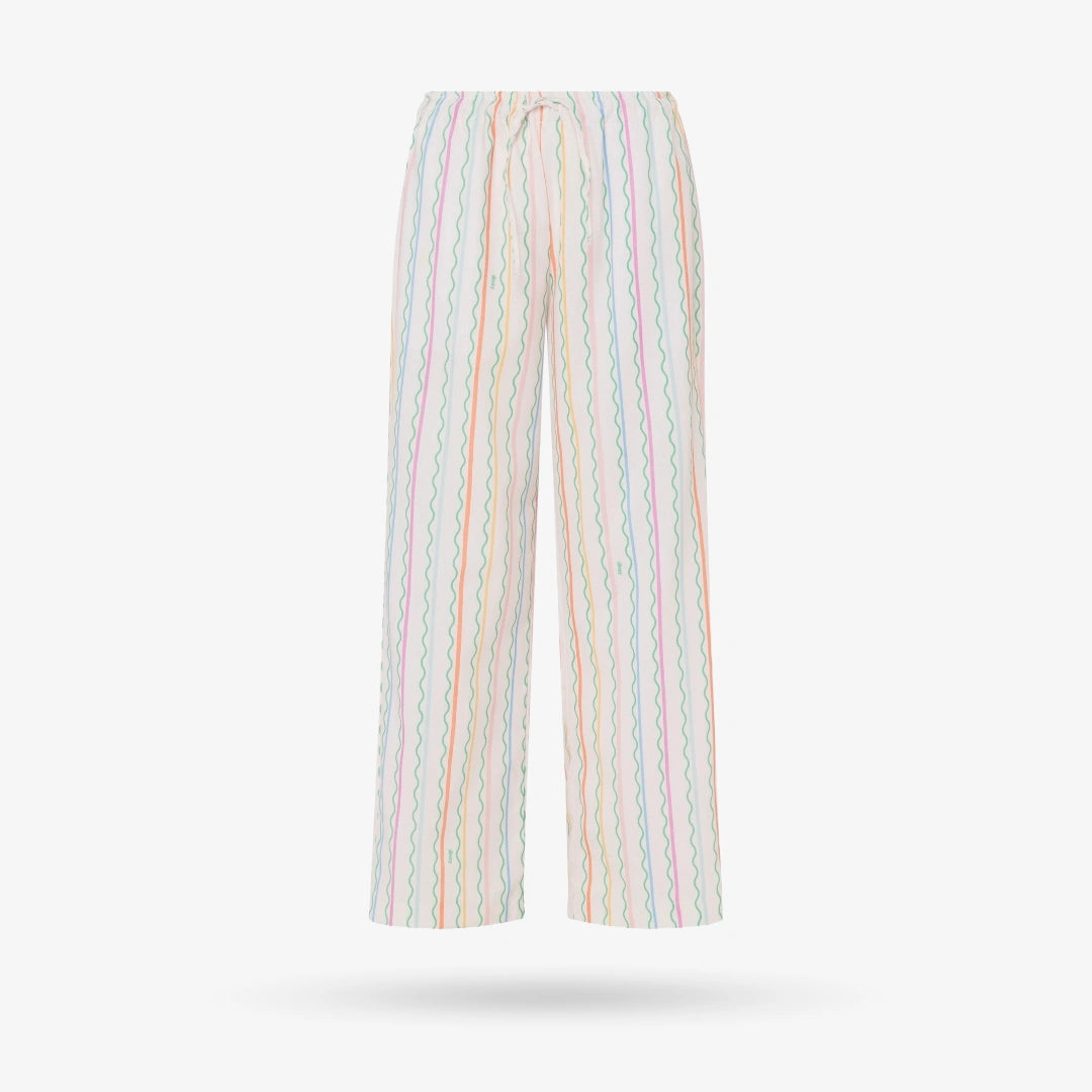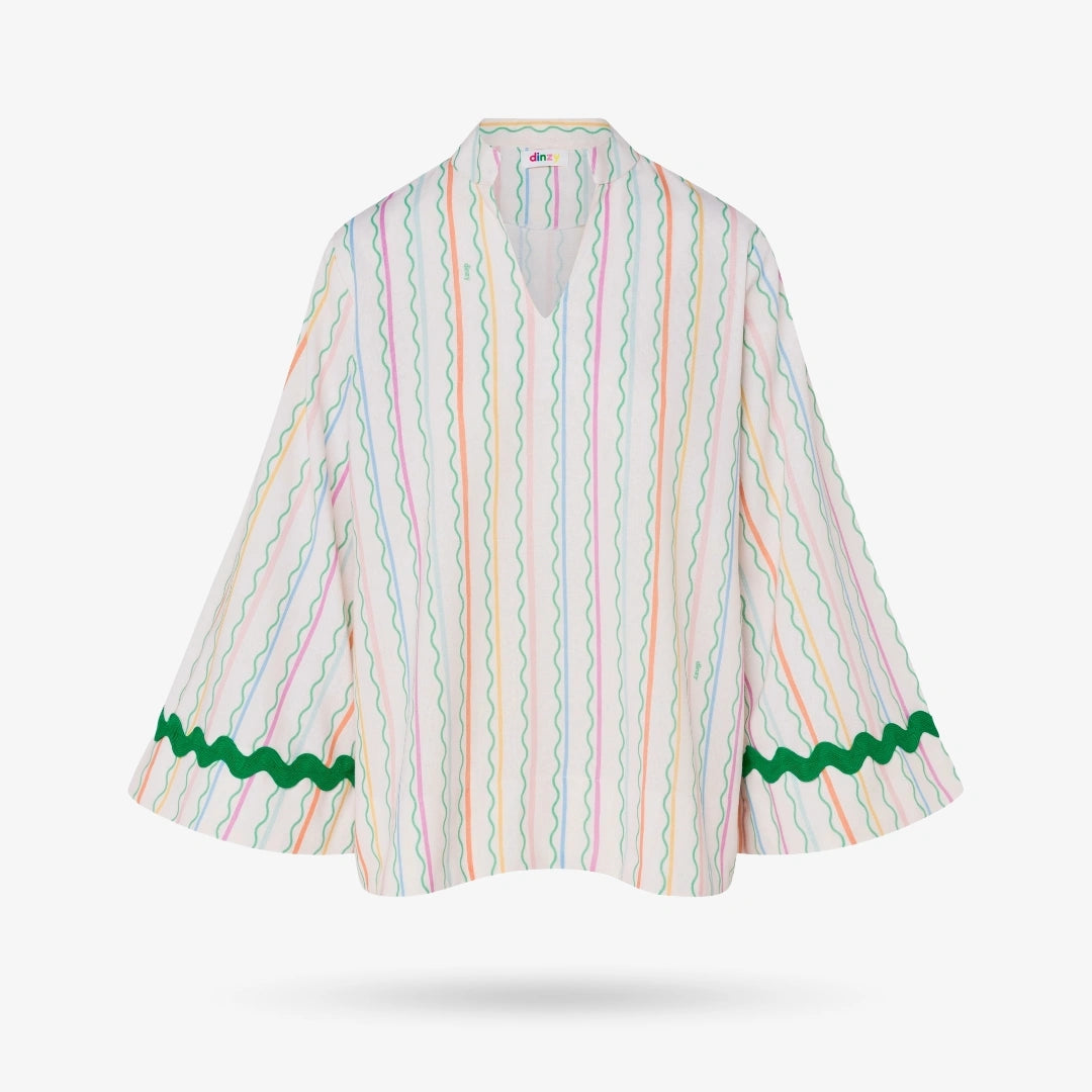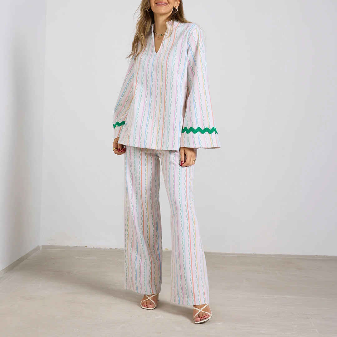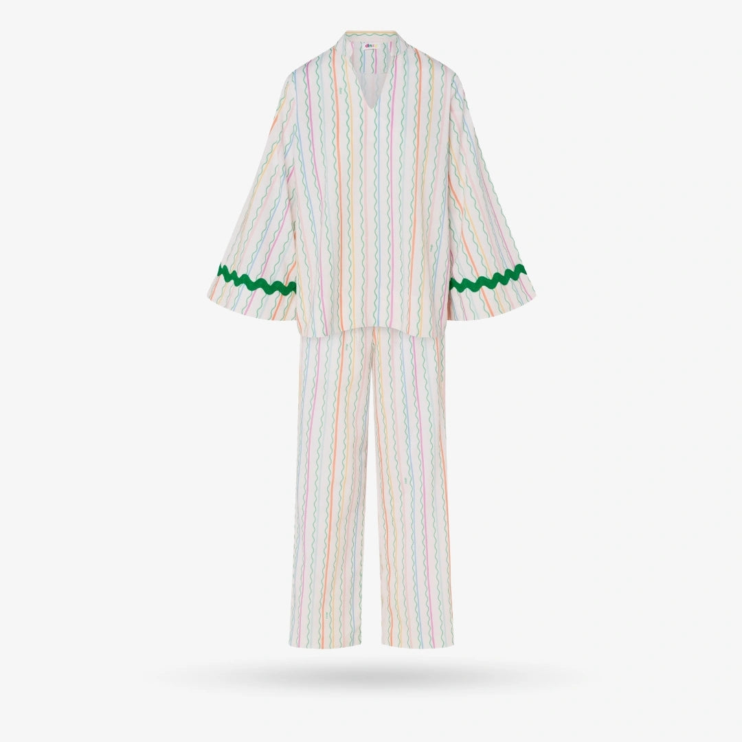 • Color: Multi-colored with a beige base• Linen viscose blend• V-neckline• Long bell sleeves• Side Pockets• Pants have elastic waistband and drawstring• Please note that each piece is unique and received dress might have different colors or layout as a result.