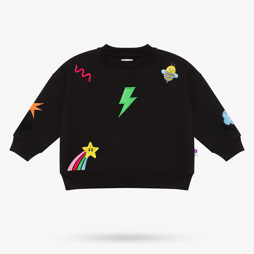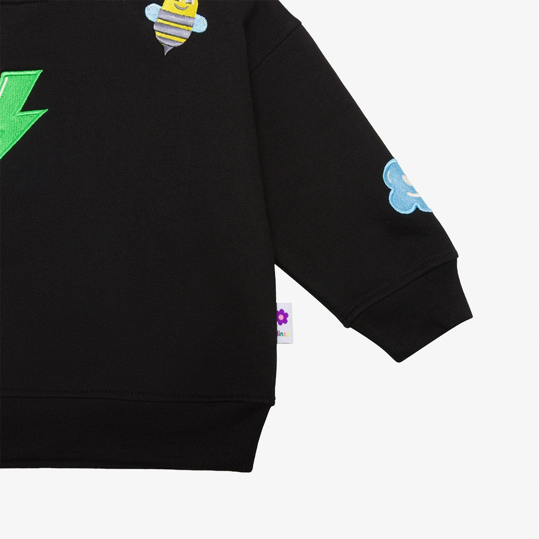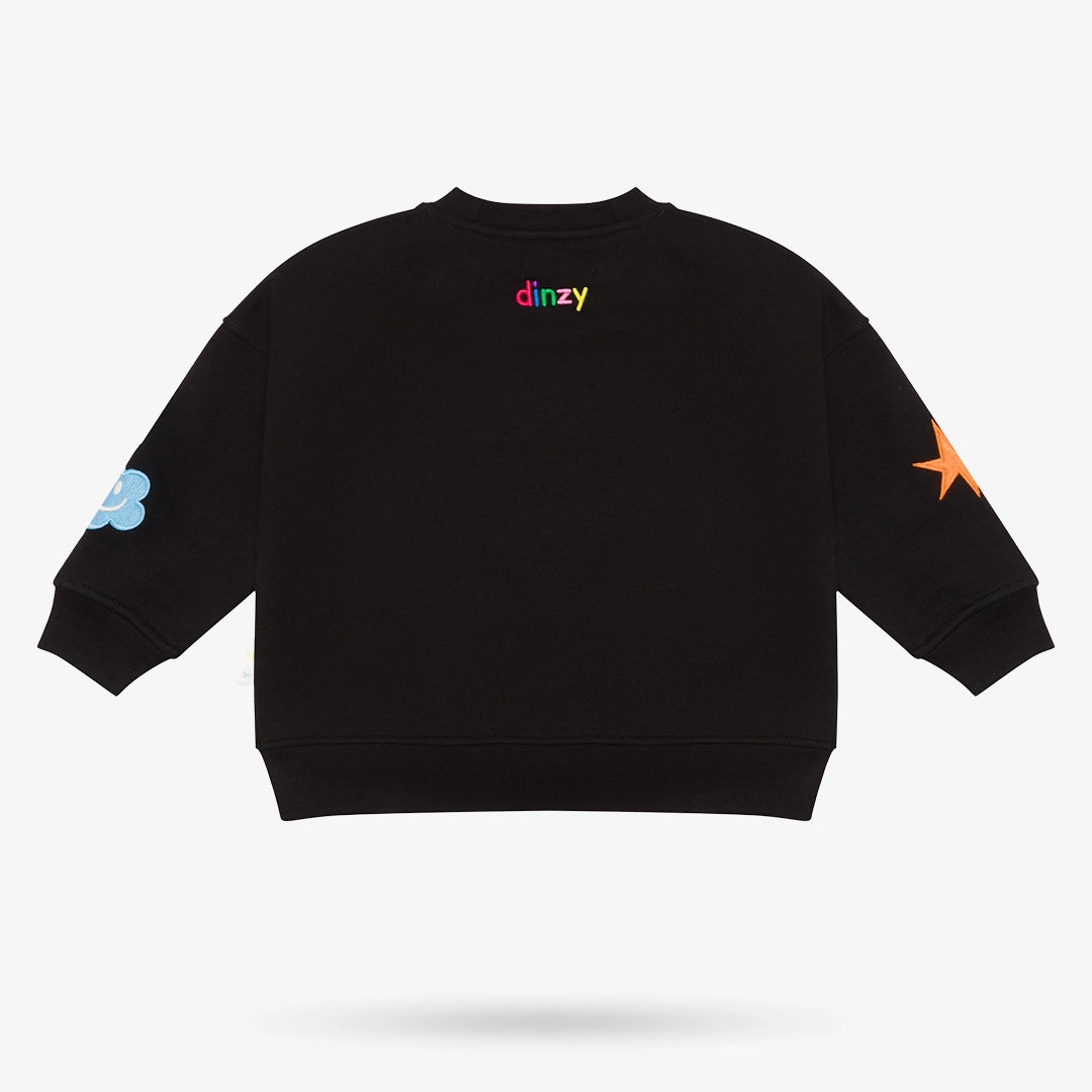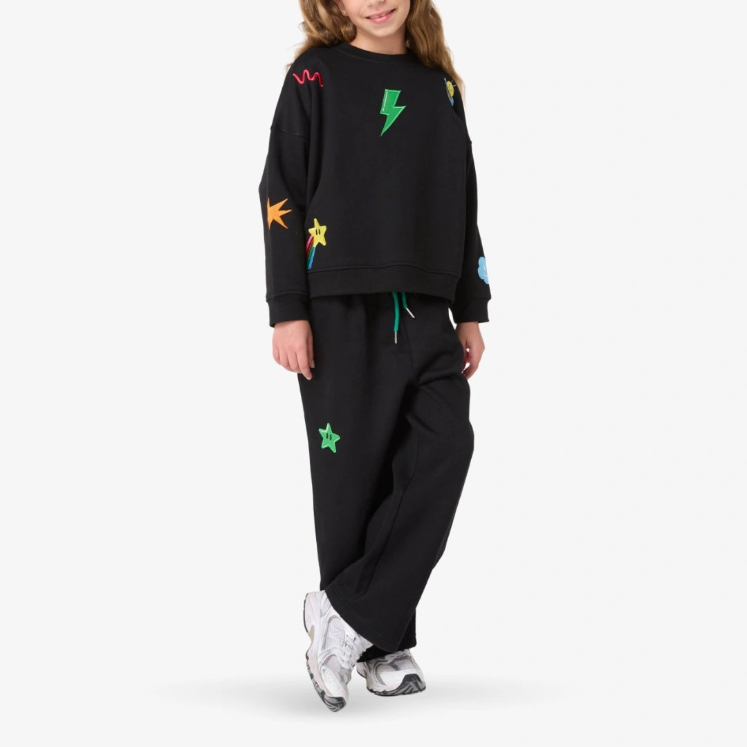 • 2-Piece Set: Sweater & Pants• Color: Black• 270 GSM mid-weight cotton fleece• Ribbed crew neck• Long sleeves with ribbed cuffs• Adjustable drawstring on Pants• Straight Leg Cut• Multi-colored embroidery