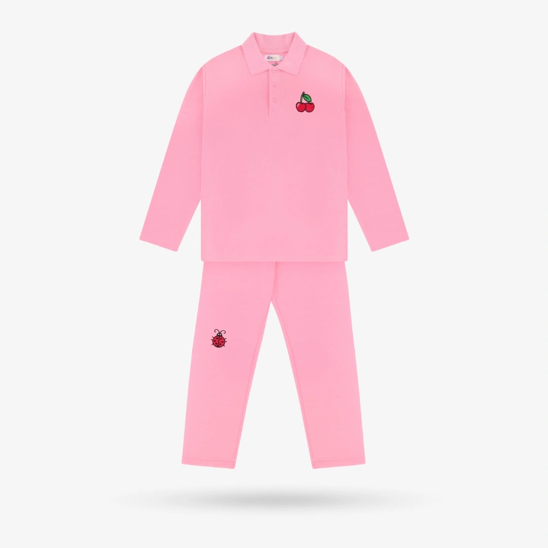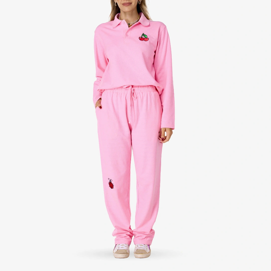 • 2 Piece Set• Color: Bubblegum Pink• Long Sleeve Polo Shirt with Matching Pants• 3 Button Placket• Pants Have Adjustable Drawstring• Multi-colored embroidery